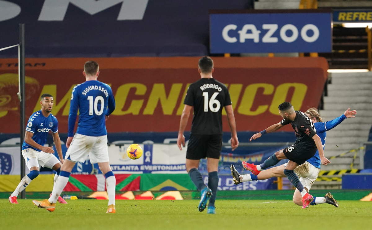 Bernardo Silva teased the Everton defence on the right flank before slipping the ball to Riyad Mahrez who unleashed an unstoppable curling drive with his left foot which crashed in off the far post.