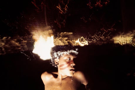 She began experimenting with double exposures, infrared lights and Vaseline-smeared lenses to evoke the yakoana-tinted reality of the people she was documenting. Filled with hallucinogenic points of light, vivid colours and unconventional compositions, her work with the Yanomami people avoids the construct of an objective reality which is the cornerstone of much photojournalism.