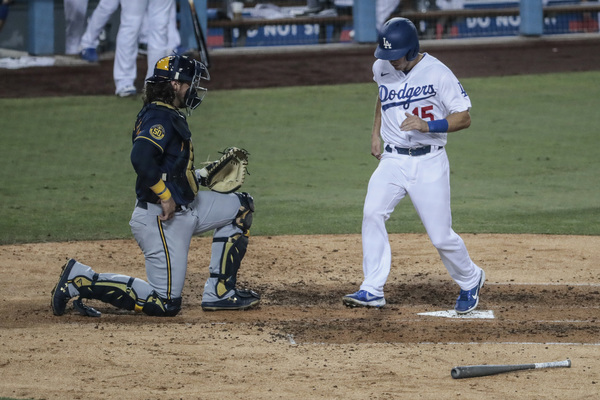 Austin Barnes, the Dodgers' No. 9 hitter, followed and laid off a 1-2 fastball Woodruff thought was strike three. Plate umpire Quinn Wolcott called it a ball. Two pitches later, he hit a perfectly placed groundball up the middle to score Chris Taylor from second base for the game's first run. Next, Mookie Betts lined a two-run double _ his third double of the series _ down the left-field line. It was all the cushion Kershaw needed.