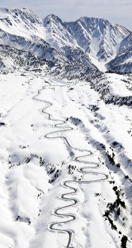 A meandering road appears on a mountain Thursday as snow removal progresses, ahead of the spring tourist season, on an about-23 kilometer section of the Tateyama Kurobe Alpine Route through the Northern Japan Alps in Toyama and Nagano prefectures. The route is scheduled to fully open on April 15. It snowed heavily this winter, so the snow-walled "valley" on the route is expected to be higher than the 17 meters seen in an average year.