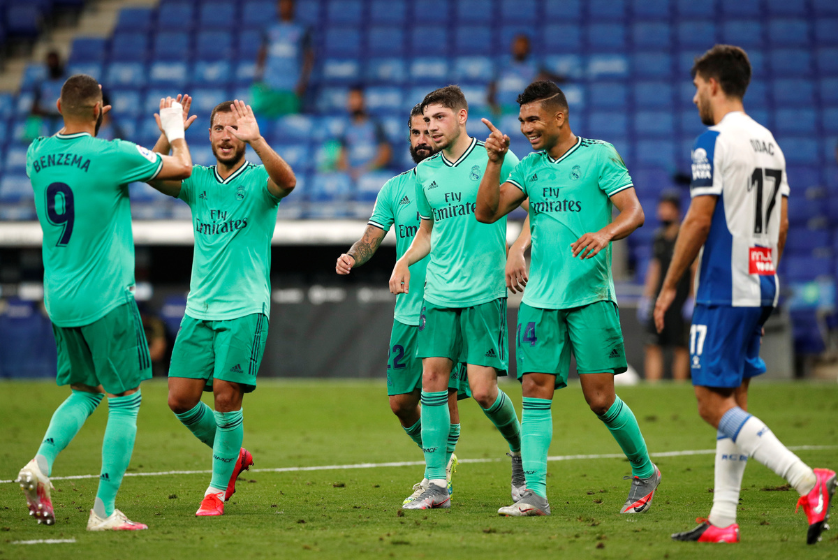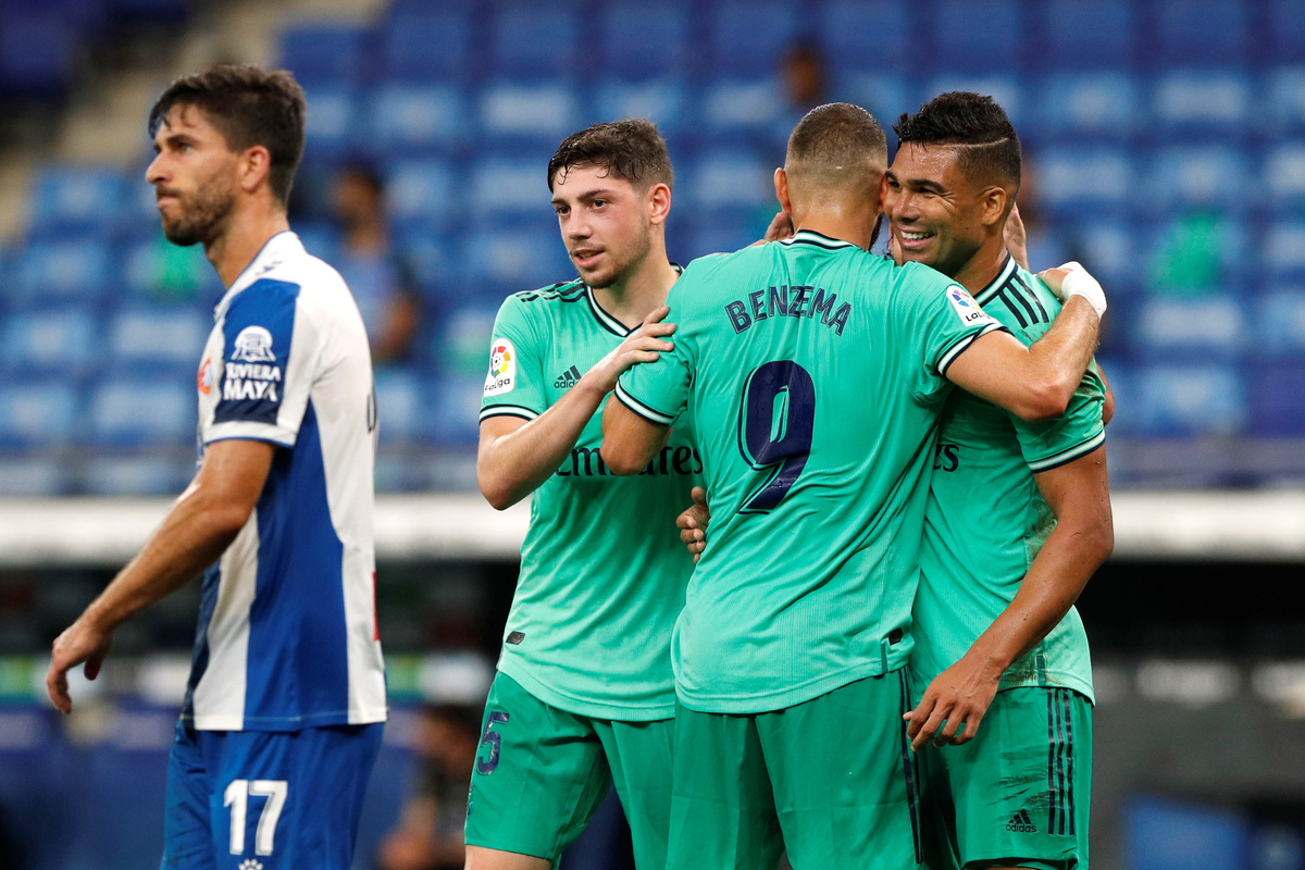 Soccer Football - La Liga Santander - Espanyol v Real Madrid - RCDE Stadium, Barcelona, Spain - June 28, 2020 Real Madrid's Casemiro celebrates scoring their first goal with teammates, as play resumes behind closed doors following the outbreak of the coronavirus disease (COVID-19) REUTERS/Albert Gea