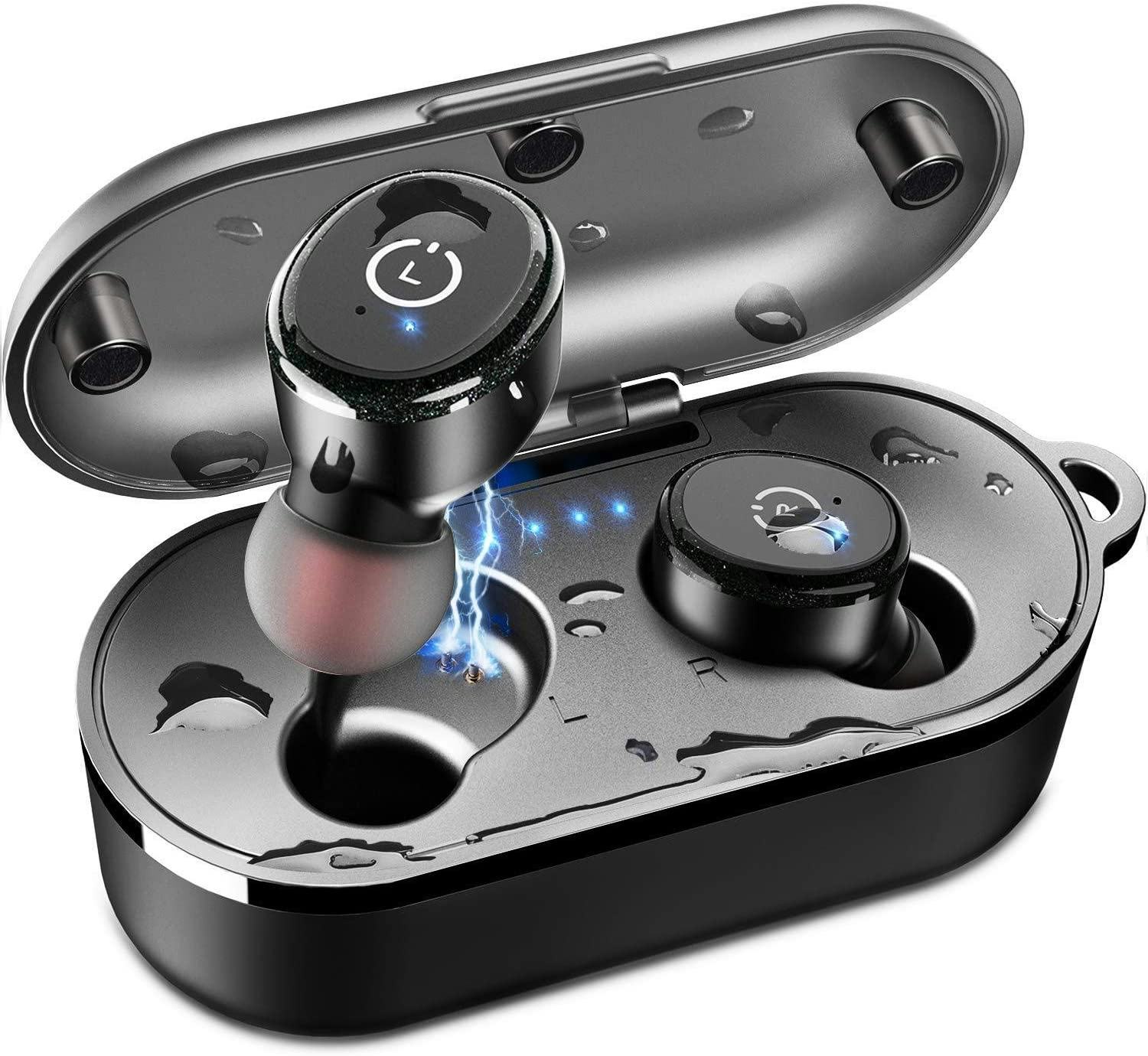 These wireless earbuds come in a charging case that can provide up to 14 hours of power — but the earbuds themselves can stay charged for four hours on their own. They're waterproof and come in five different colors, including black, white, blue, khaki, and gray.