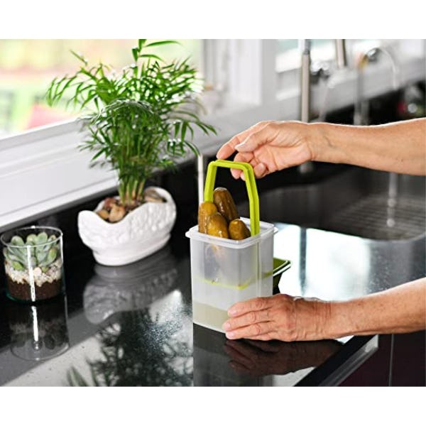 If you don’t like getting your hands wet retrieving a pickle from the jar, put them in this storage container with a strainer insert. Just lift the basket out of the juice to grab one. It’s perfect for everything from olives to pickles to fruit canned in liquid.