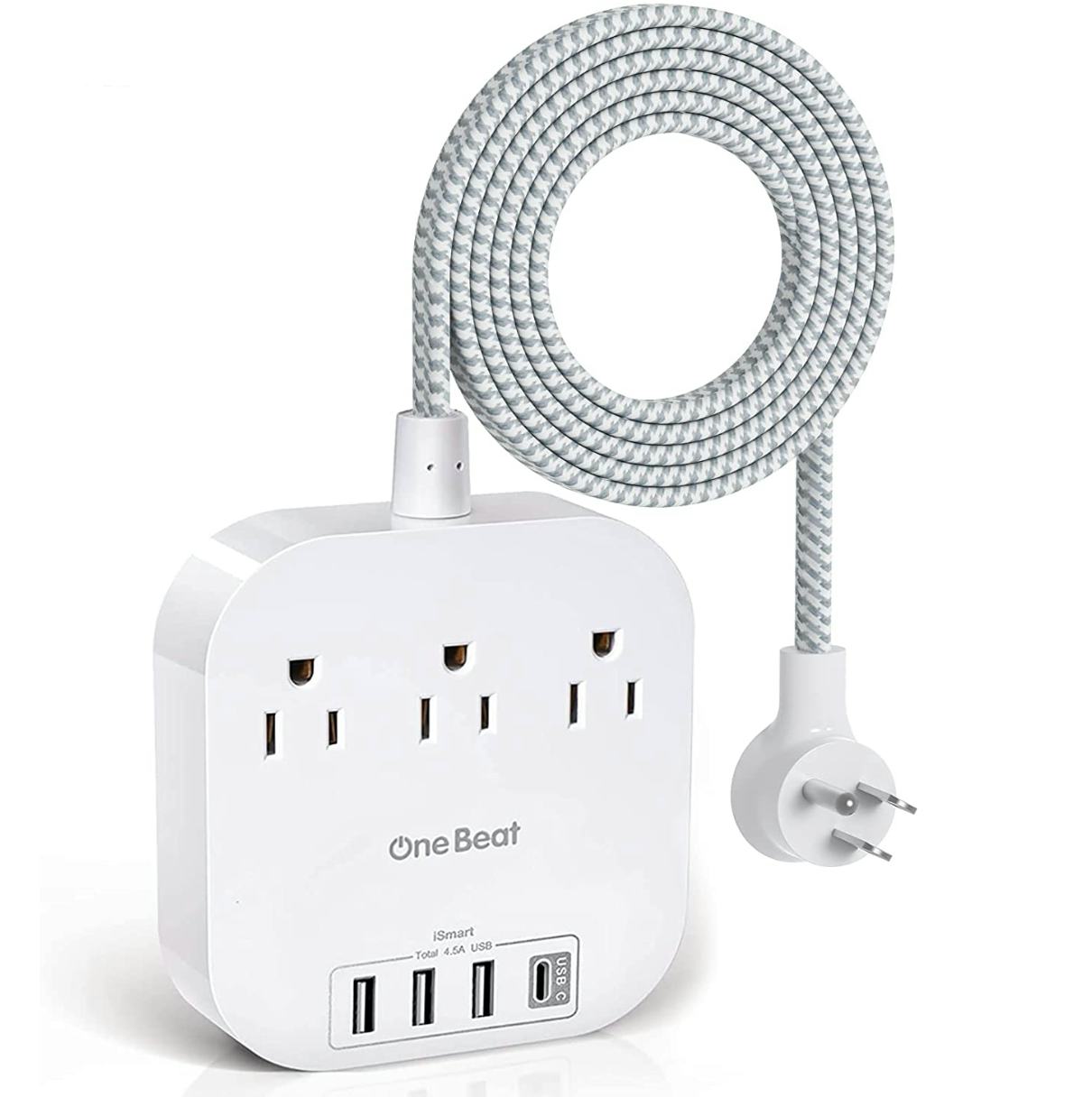 This handy power strip is everything you need to bring power where you need it. It has a flat plug so it will fit behind the furniture. The 5-foot braided cord is flexible and decorative. And the power strip has three widely-spaced standard plugs, three USB-A plugs, and one USB-C plug.