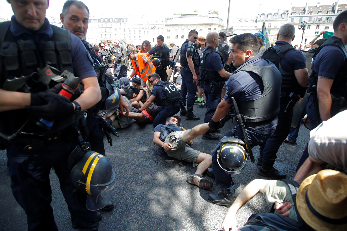 PARIS (Reuters) - French police used riot shields and pepper spray to clear scores of climate activists blocking a bridge over the Seine in Paris on Friday, as the city sweltered under a record-breaking heatwave that many blame on global warming.