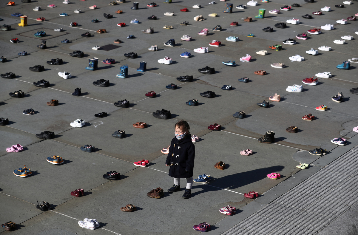 A child wearing a face mask stands surrounded by shoes, after Civil disobedience group Extinction Rebellion laid out 1,500 pairs of children's shoes in Trafalgar Square in central London in a protest to demand the government adopts a climate-friendly economic recovery plan, following the outbreak of the coronavirus disease (COVID-19), London, Britain May 18, 2020. REUTERS/Simon Dawson TPX IMAGES OF THE DAY
