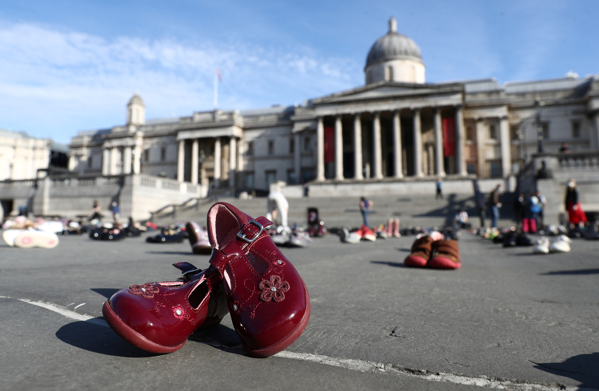 Climate activists placed more than 2,000 pairs of children's shoes in neat rows across London's Trafalgar Square on Monday to demand the British government stop bailing out carbon intensive industries that pollute the environment.