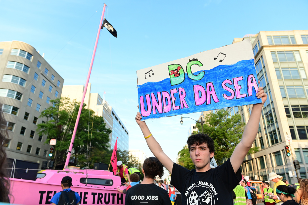 Climate activists block traffic in U.S. capital, chain themselves to sailboat