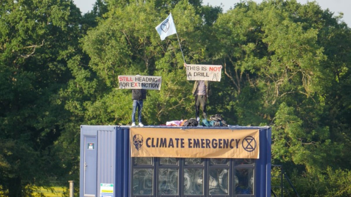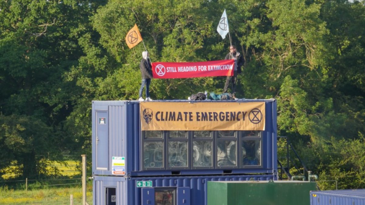 Extinction Rebellion activists hold a banner as they stage a protest at the Horse Hill oilfield, partly owned by the British energy company UK Oil & Gas, in Surrey, Britain, June 1, 2020. Steve Ringham/Jono/Extinction Rebellion South East/via REUTERS. THIS IMAGE HAS BEEN SUPPLIED BY A THIRD PARTY.Extinction Rebellion activists hold banners as they stage a protest at the Horse Hill oilfield, partly owned by the British energy company UK Oil & Gas, in Surrey, Britain, June 1, 2020. Steve Ringham/Jono/Extinction Rebellion South East/via REUTERS. THIS IMAGE HAS BEEN SUPPLIED BY A THIRD PARTY.