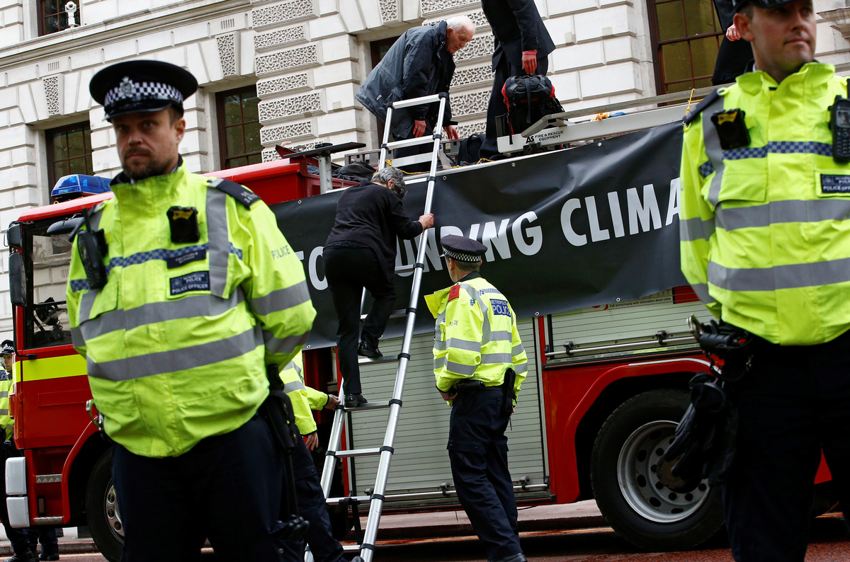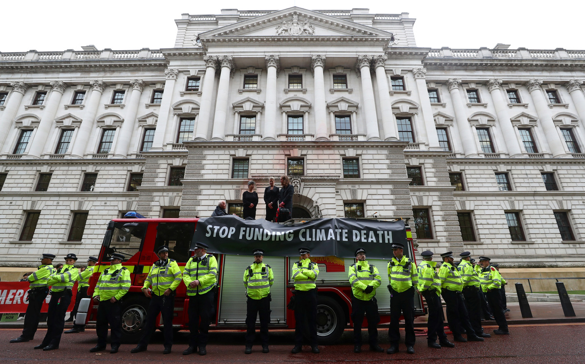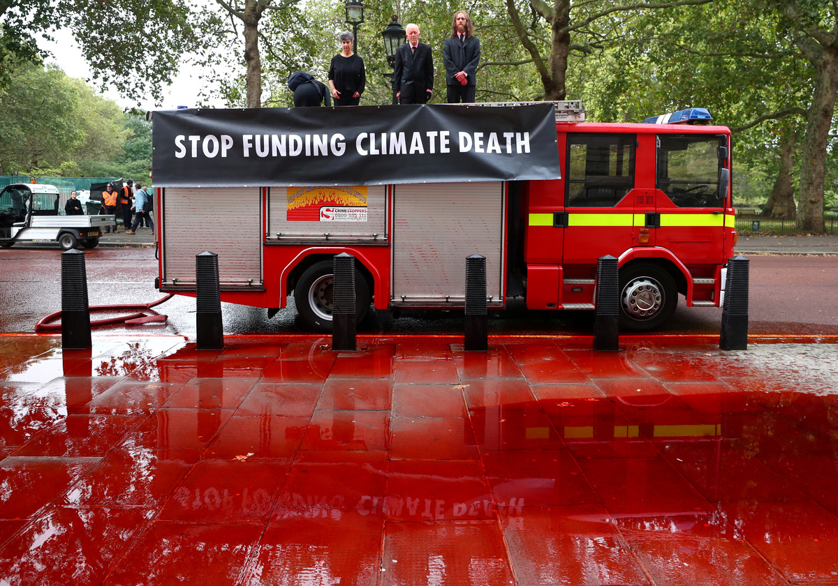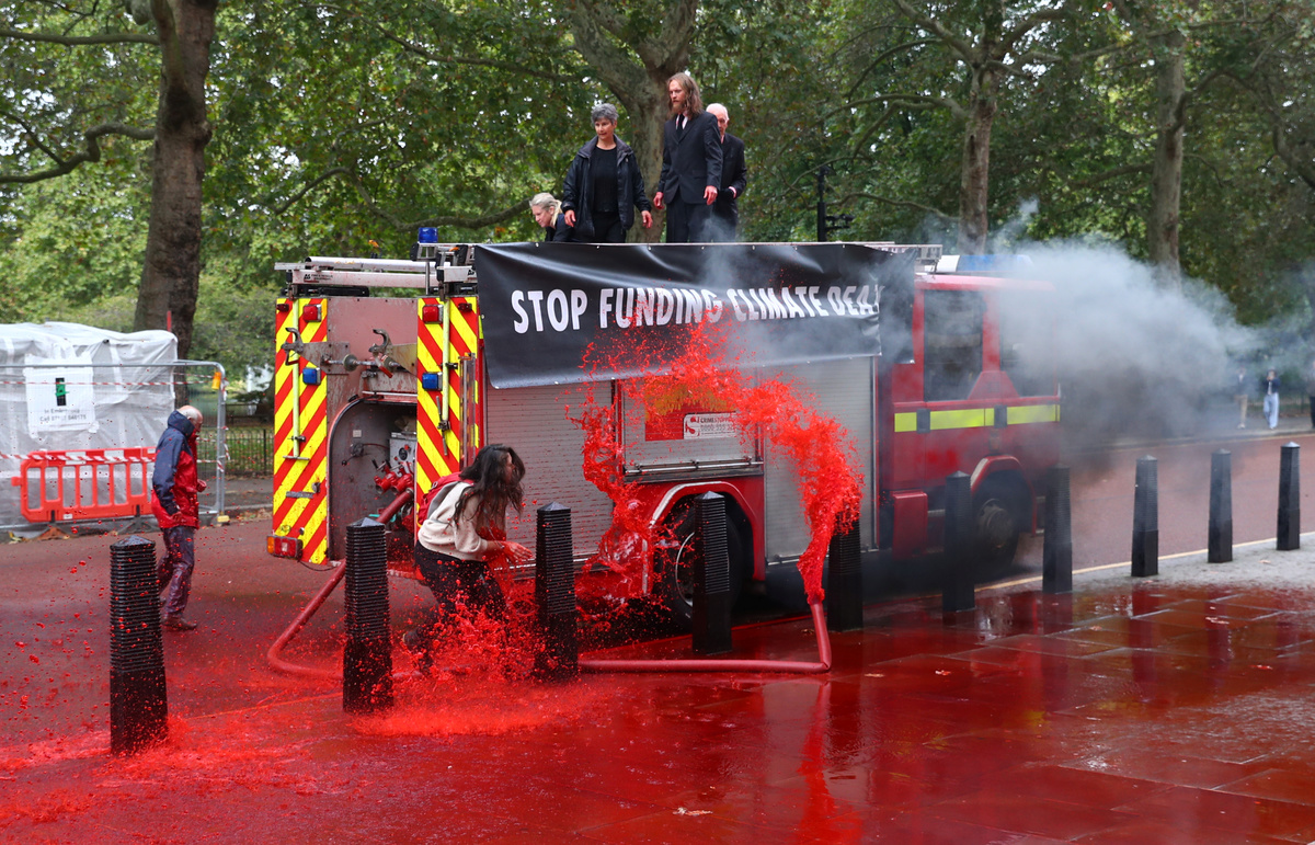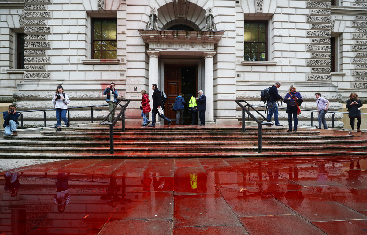 LONDON (Reuters) - Climate change activists used a fire engine to hose a red liquid at the facade of the British finance ministry on Thursday in an attempt to draw attention to what they said was the government's failure to avert a looming climate cataclysm.
