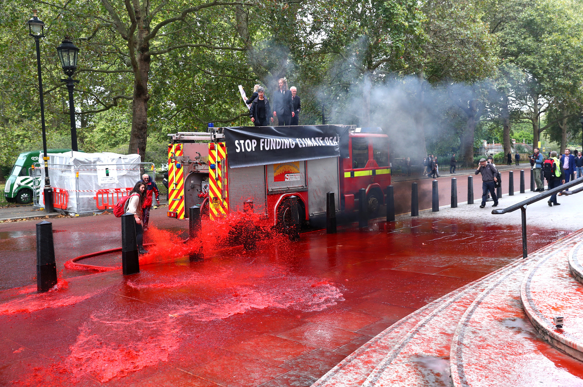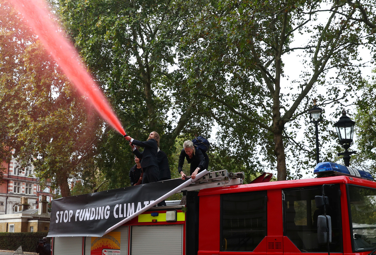 After the stunt, four activists including an 83-year-old man stood on the roof of the fire engine, from which they hung a banner saying "Stop funding climate death", a slogan that was also daubed onto the wall of the imposing central London building.