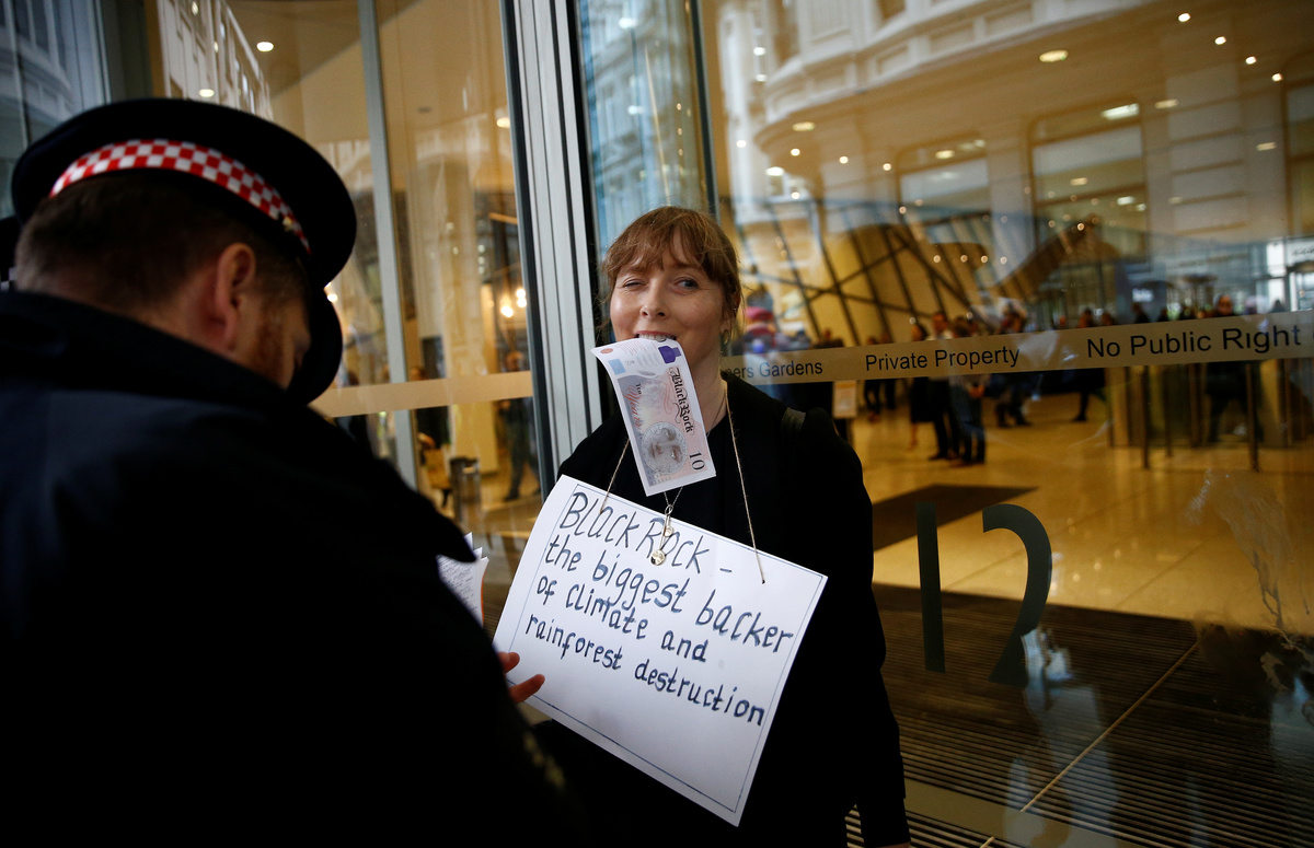 Protesters hold a banner outside the BlackRock office during an Extinction Rebellion demonstration in the City of London, Britain October 14, 2019. REUTERS/Henry Nicholls