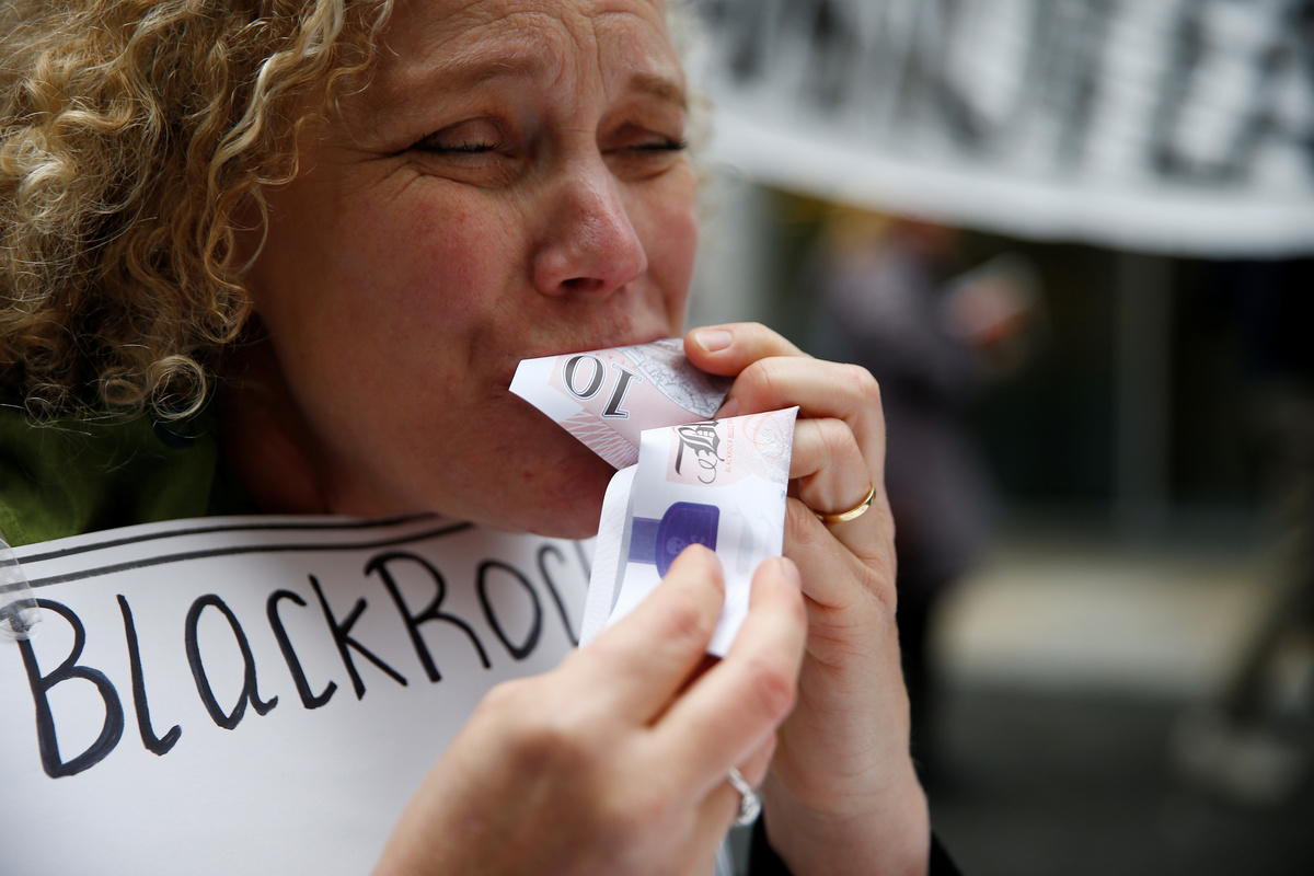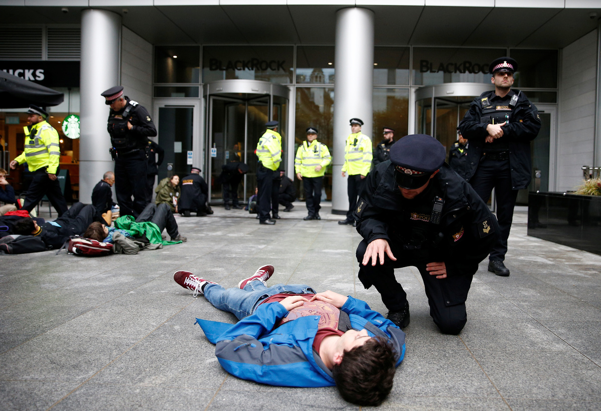 A protester eats fake money outside the BlackRock office during an Extinction Rebellion demonstration in the City of London, Britain October 14, 2019. REUTERS/Henry NichollsA protester eats fake money outside the BlackRock office during an Extinction Rebellion demonstration in the City of London, Britain October 14, 2019. REUTERS/Henry NichollsProtesters eat fake money outside the BlackRock office during an Extinction Rebellion demonstration in the City of London, Britain October 14, 2019. REUTERS/Henry NichollsProtesters hold a banner outside the BlackRock office during an Extinction Rebellion demonstration in the City of London, Britain October 14, 2019. REUTERS/Henry NichollsPolice officers talk with protesters as they lie on the ground outside of the entrance to BlackRock offices during an Extinction Rebellion demonstration in the City of London, Britain October 14, 2019. REUTERS/Henry NichollsPolice officers talk with protesters as they lie on the ground outside of the entrance to BlackRock offices during an Extinction Rebellion demonstration in the City of London, Britain October 14, 2019. REUTERS/Henry NichollsProtesters lie on the ground outside of the entrance to BlackRock offices during an Extinction Rebellion demonstration in the City of London, Britain October 14, 2019. REUTERS/Henry Nicholls