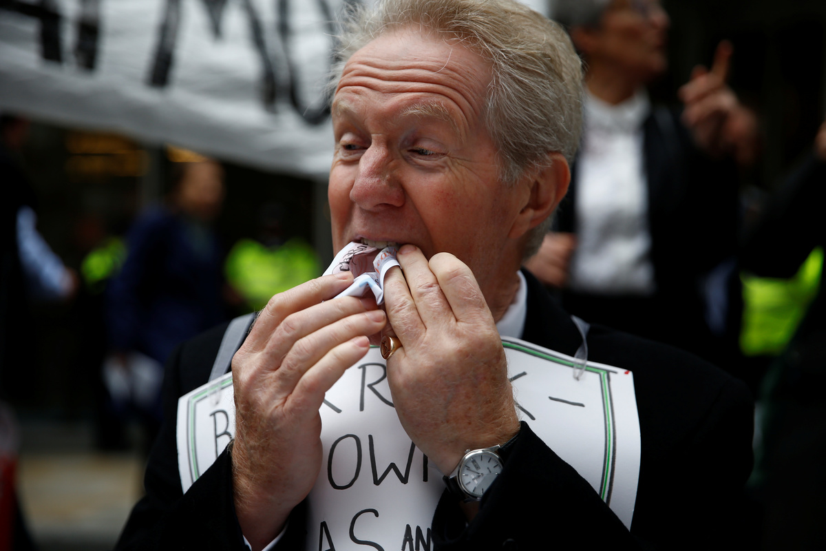 A protester eats fake money outside the BlackRock office during an Extinction Rebellion demonstration in the City of London, Britain October 14, 2019. REUTERS/Henry Nicholls