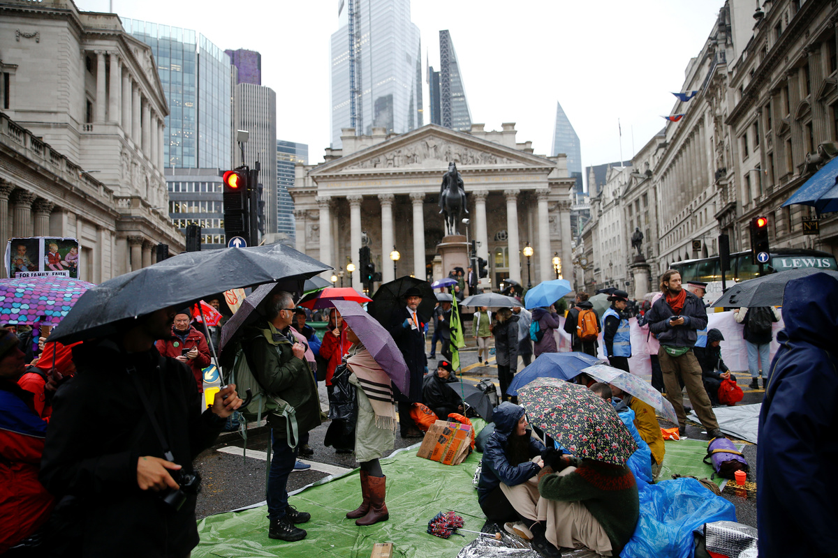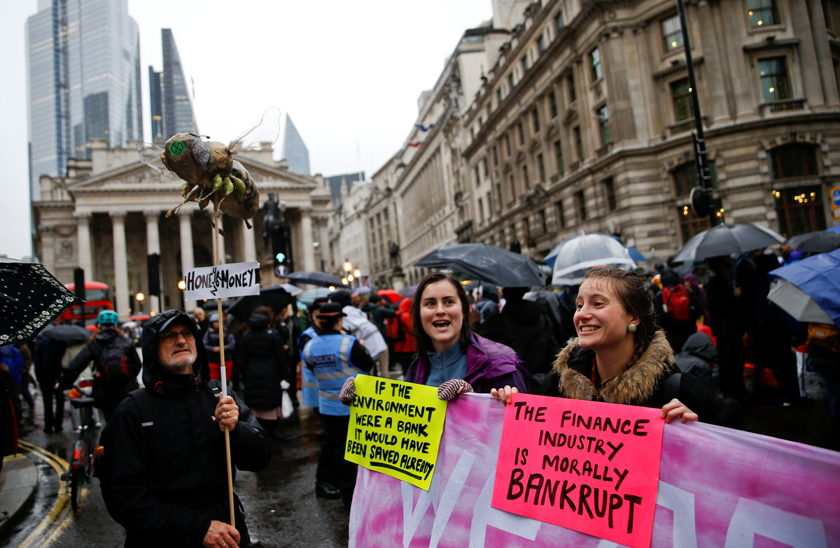 Activists thronged the financial heart of London on Monday, unfurling banners, addressing passersby by megaphone or blocking streets around locations including BlackRock, the Bank of England, Bank of China and Barclays.