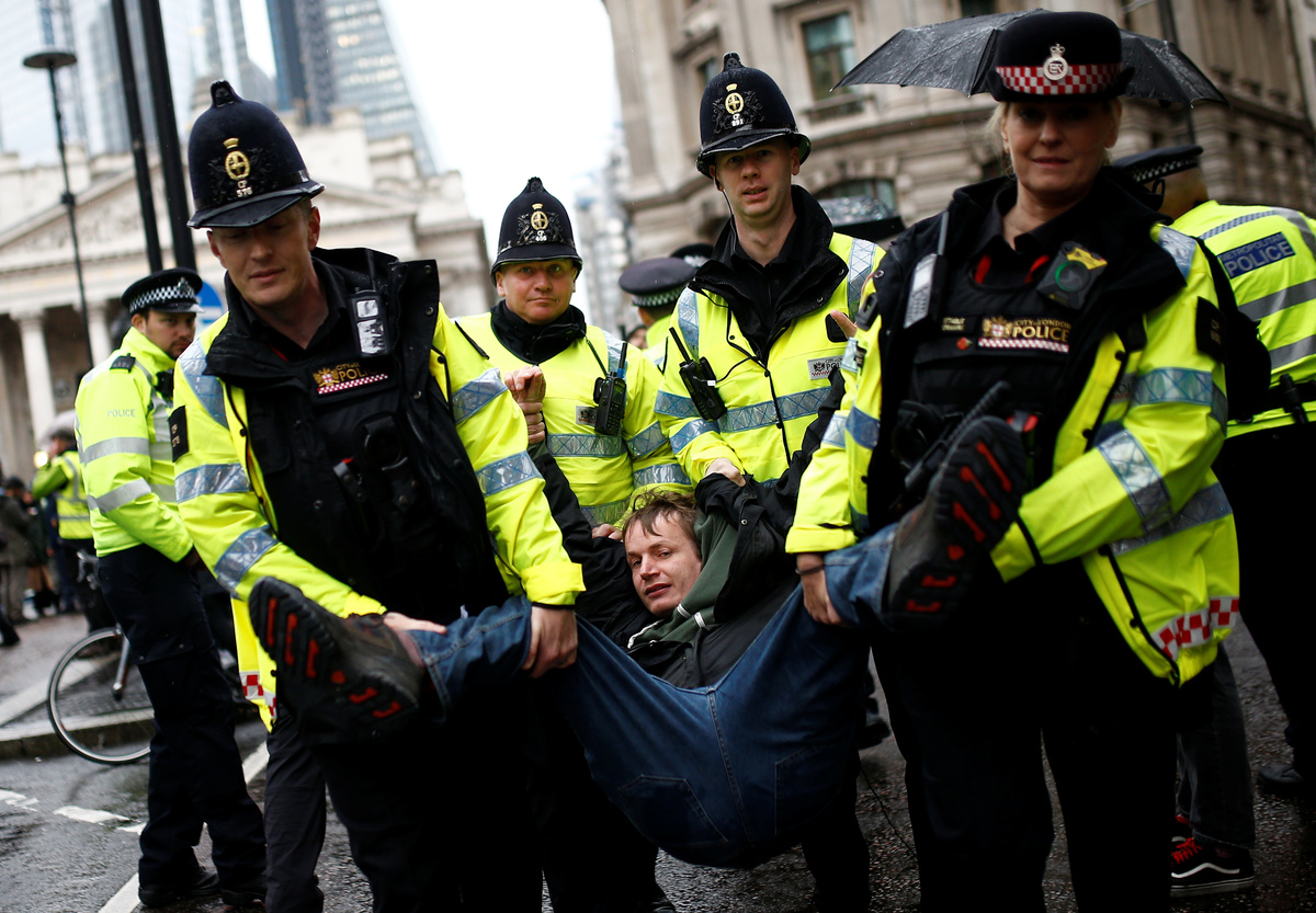 At BlackRock, volunteers glued themselves to the doors while others staged a mock dinner party with rolled-up banknotes on their plates. Police said they arrested more than 90 people.