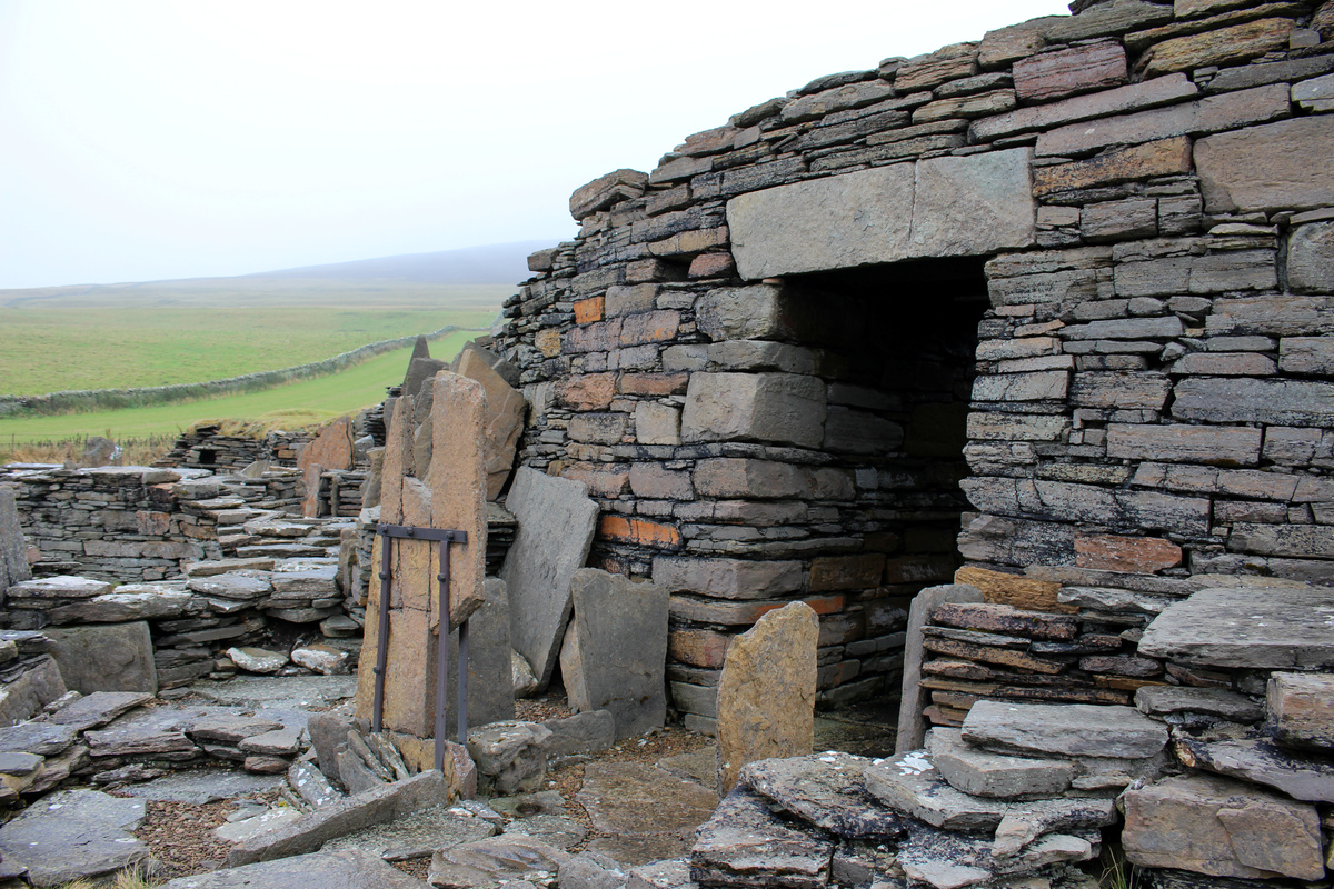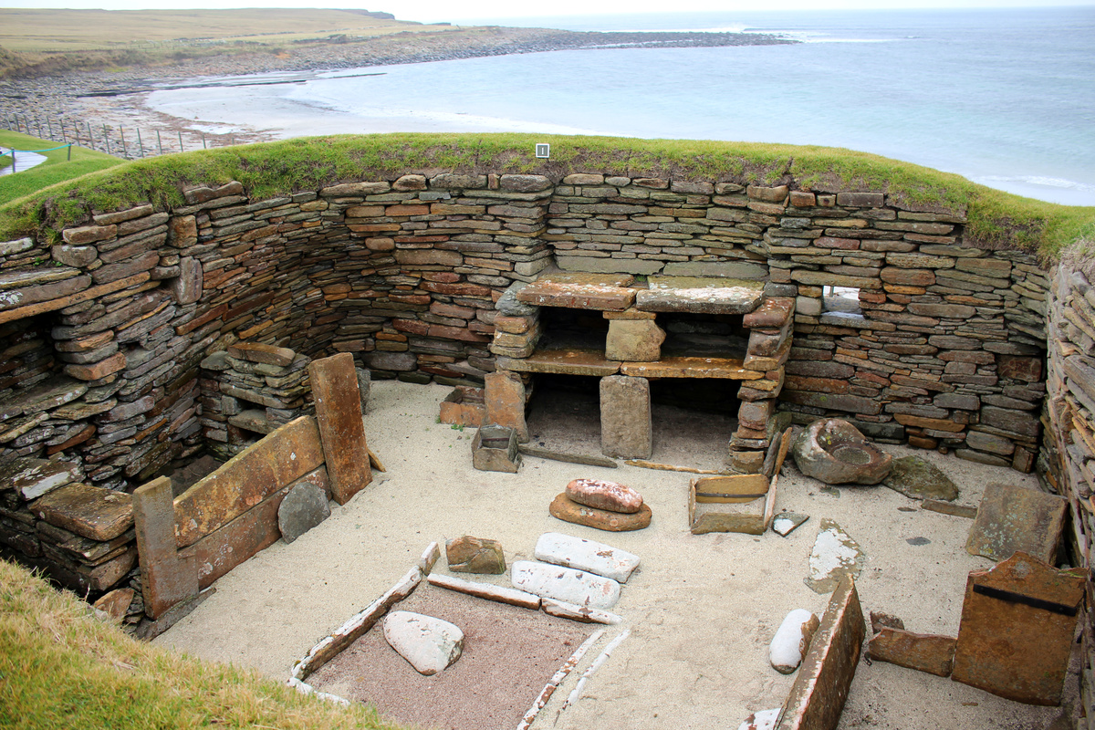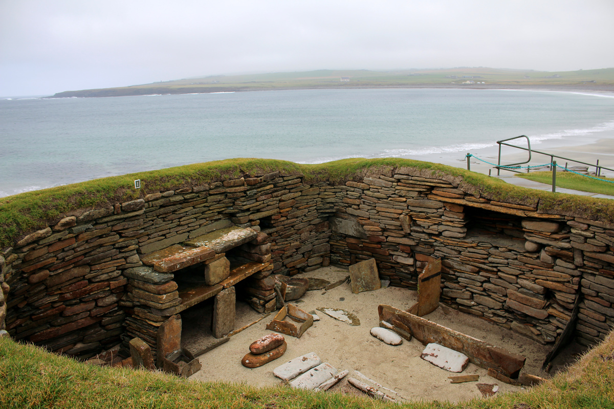 Arguably the most famous site of Orkney is Skara Brae. This Neolithic settlement, occupied from roughly 3100-2500BC, features a network of stone buildings. When inhabited it was approximately one kilometer (0.6 miles) from the sea with a freshwater loch and sand dunes in between. Now it sits only a few meters from the North Atlantic.