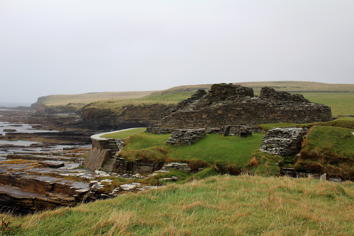 A couple of hundred meters north of South Howe Broch is Midhowe Broch. This Iron Age building is well-preserved, courtesy of a sea wall built in the 1930s and well-maintained since. A spring-fed water tank, fireplace and room partitions are clearly visible. But even Midhowe Broch is at risk from climate change.