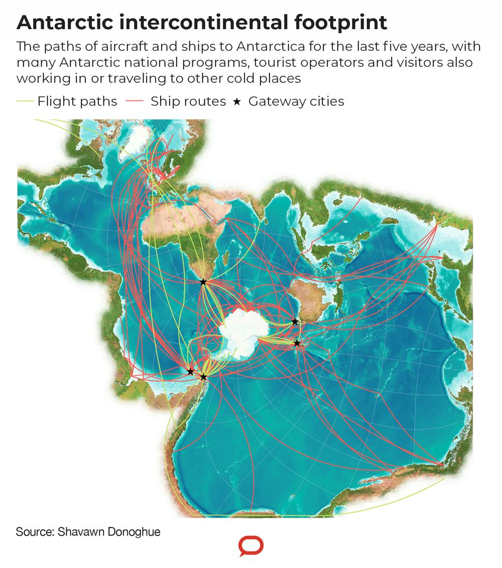 We tend to think Antarctica is isolated and far away — biologically speaking, this is true. But the continent is busier than you probably imagine, with many national programs and tourist operators crisscrossing the globe to get there.