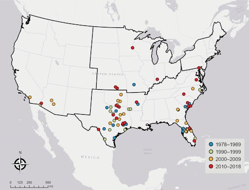 For the recently released study, CDC researchers studied four decades' worth of data related to N. fowleri infections in the U.S., spanning from 1978 to 2018. They selected 85 cases that fit their criteria — ones that stemmed from water infections and had location data — and noted them on a map. The scientists also took a look at the environment and weather at the time of infection.