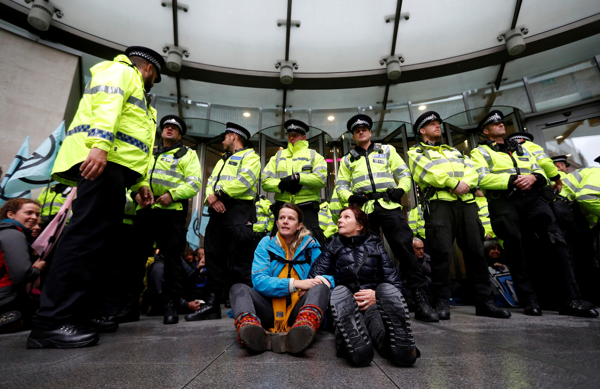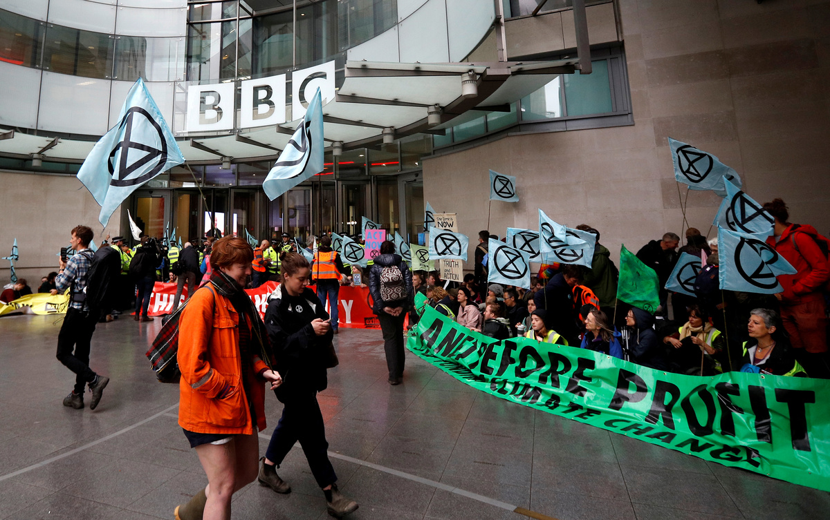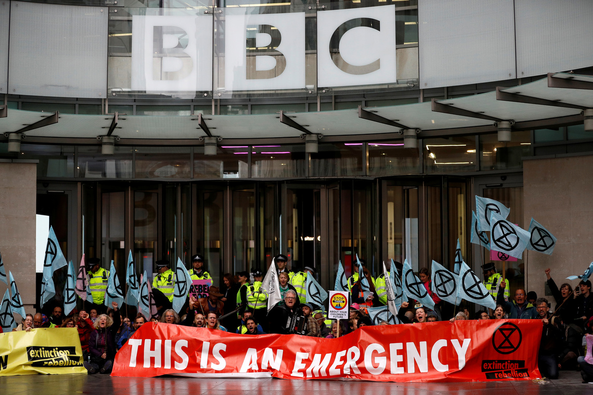 LONDON (Reuters) - Extinction Rebellion protesters blocked the BBC's headquarters on Friday, calling on Britain's public service broadcaster to treat climate change with the same gravity as World War Two and tell the public the truth.
