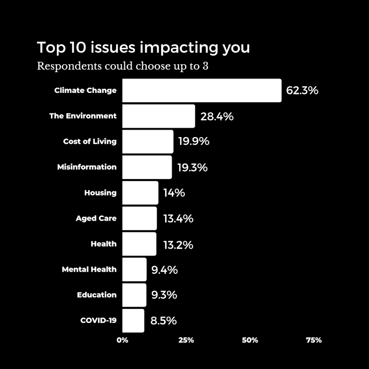 Respondents could choose up to three topics close to their hearts. The next most common answers after climate change (62.3%) were: the environment (28.4%), cost of living (19.9%), misinformation (19.3%) and housing (14%).