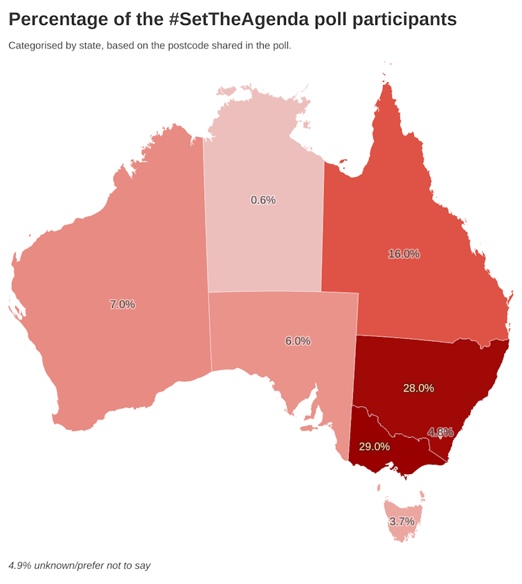 Rounding out the top ten concerns were aged care, health, mental health, education and COVID-19. The topics of gender equity (7.6%) and First Nations representation (7.3%) also featured highly, just outside the top ten.