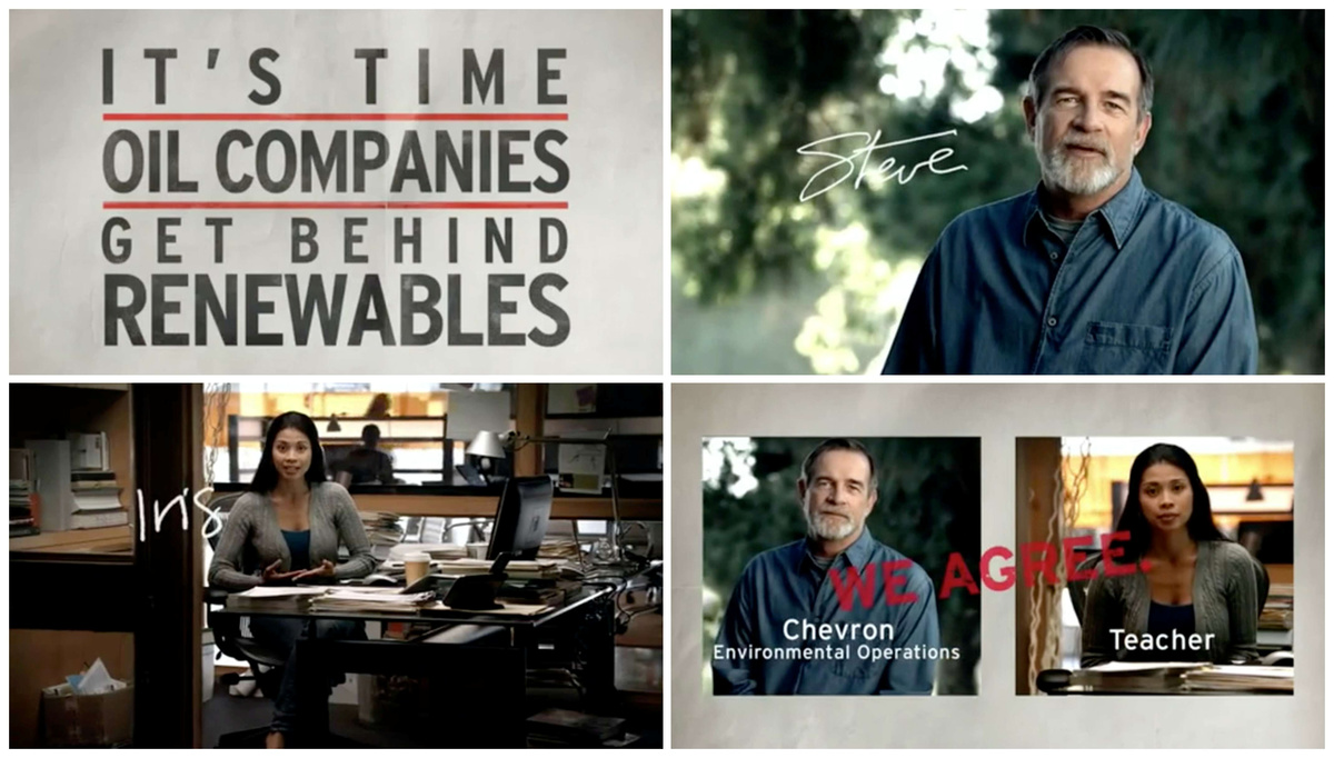 "I think renewable energy is vital to our planet," says the man, identified only as an environmental expert called Steve. "At Chevron we're investing millions in solar and biofuels technology to make it work." He adds that the energy can be made widely available and the work needs to begin “right now.”