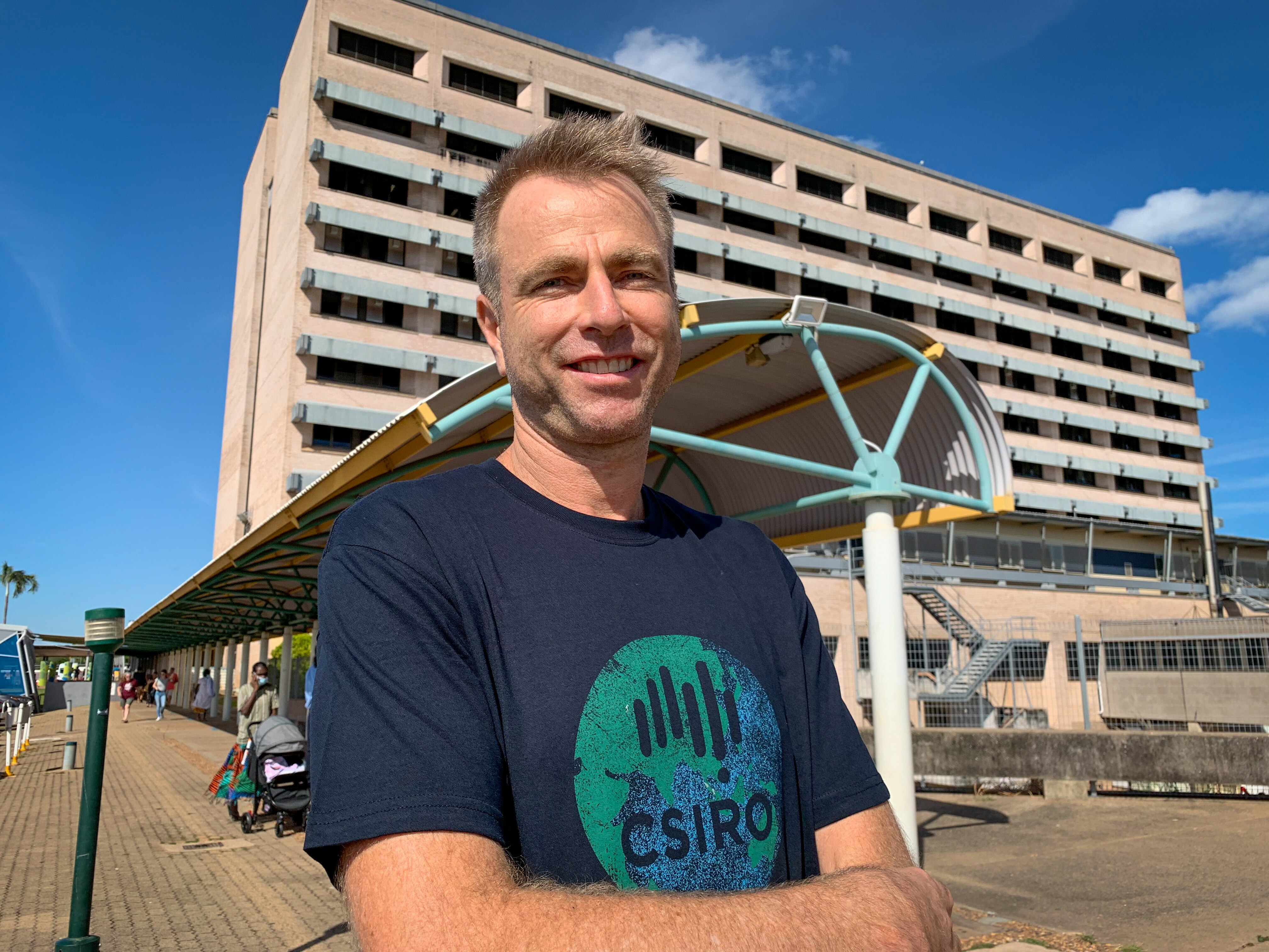 Royal Darwin Hospital is a 1970s concrete monolith surrounded by acres of bitumen car parks and adjacent buildings.