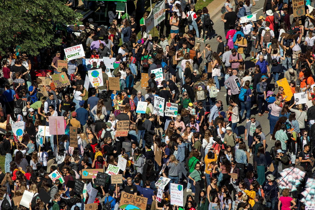 Matthew McMillan, 22, a mechanical engineering student at Montreal's Concordia University, held a "Make America Greta Again" poster as he joined other students at the protest.