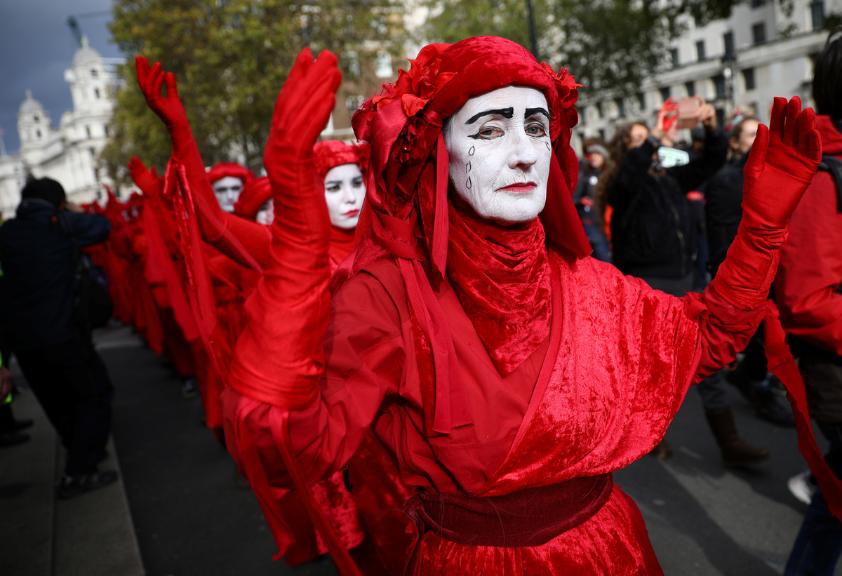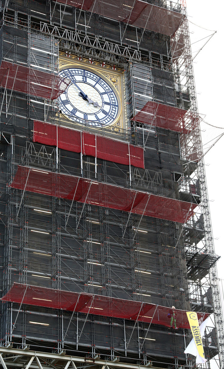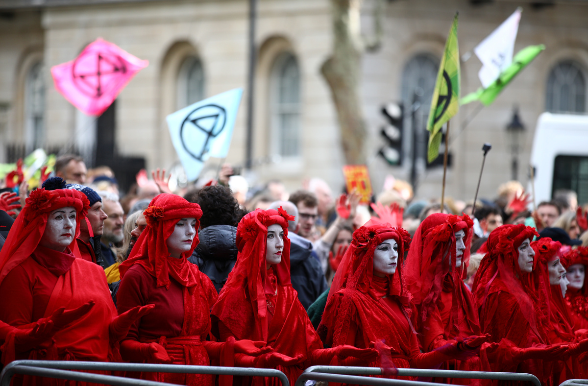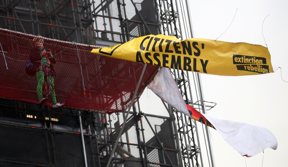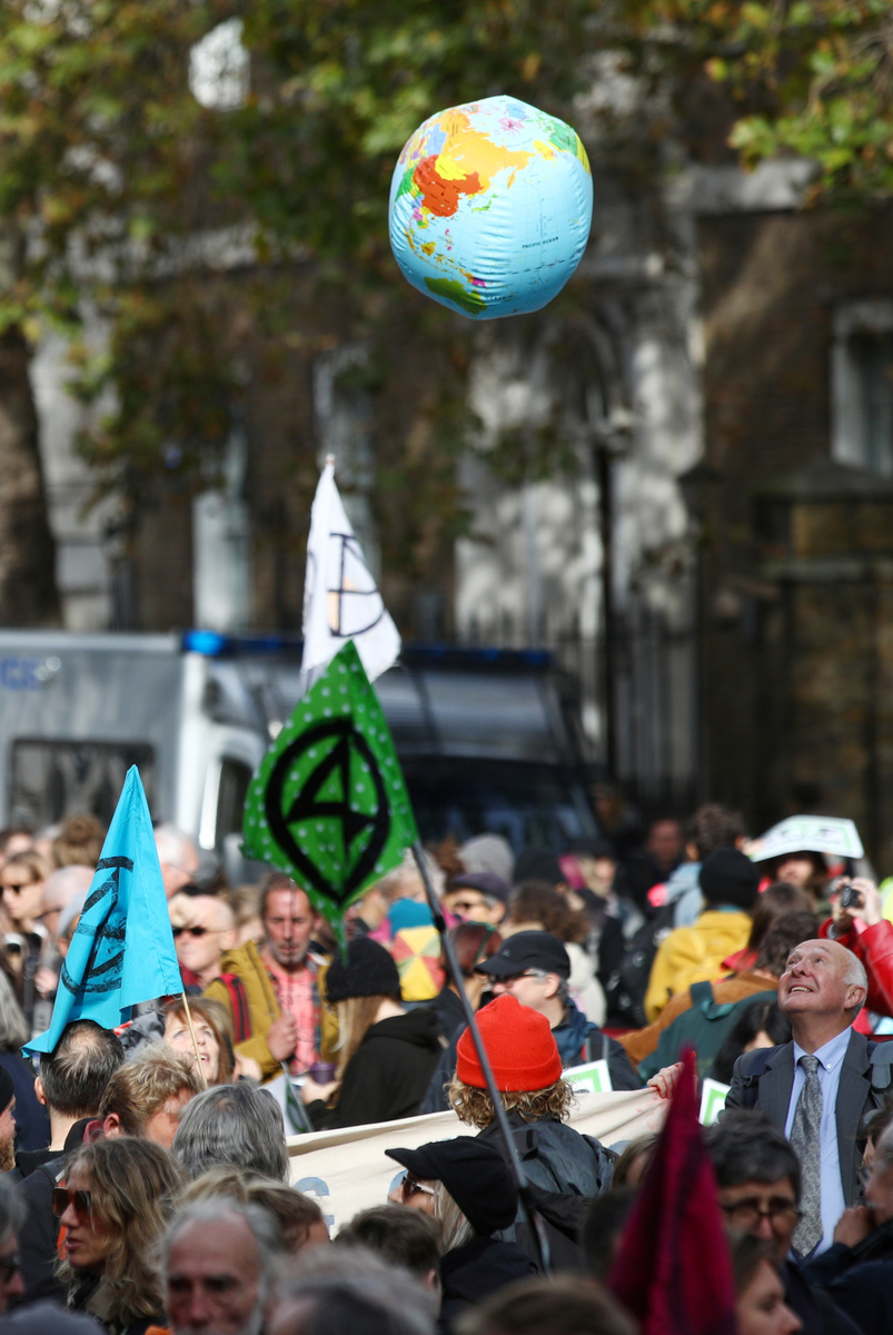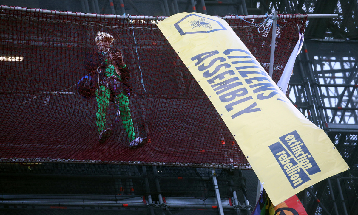An Extinction Rebellion climate change activist is seen on the scaffolding of the Big Ben tower in London, Britain, October 18, 2019. REUTERS/Tom Nicholson An Extinction Rebellion climate change activist is seen on the scaffolding of the Big Ben tower in London, Britain, October 18, 2019. REUTERS/Tom Nicholson An Extinction Rebellion climate change activist is seen on the scaffolding of the Big Ben tower in London, Britain, October 18, 2019. REUTERS/Tom NicholsonAn Extinction Rebellion climate change activist is seen on the scaffolding of the Big Ben tower in London, Britain, October 18, 2019. REUTERS/Tom Nicholson An Extinction Rebellion climate change activist is seen on the scaffolding of the Big Ben tower in London, Britain, October 18, 2019. REUTERS/Tom Nicholson Activists protest during an Extinction Rebellion demonstration in Whitehall, London, Britain October 18, 2019. REUTERS/Tom Nicholson NO RESALES. NO ARCHIVES"Red Brigade" activists protest during an Extinction Rebellion demonstration in Whitehall, London, Britain October 18, 2019. REUTERS/Tom Nicholson "Red Brigade" activists walk during an Extinction Rebellion demonstration in Whitehall, London, Britain October 18, 2019. REUTERS/Tom Nicholson