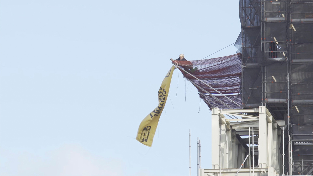 Tree surgeon Ben Atkinson, 43, unfurls an Extinction Rebellion banner after climbing up the scaffolding of Big Ben tower in London, Britain, October 18, 2019, in this still image from video obtained via social media. Taylor Underwood via REUTERS
