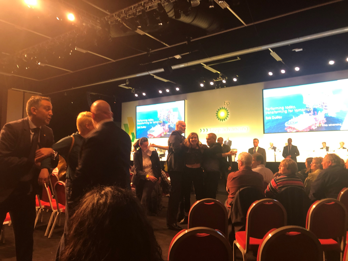 Two women protesters inside BP's annual general meeting (AGM) in Aberdeen, Scotland, were carried out by security staff, while others turned on an alarm during BP Chief Executive Bob Dudley's speech as activists complained the UK-based group was not doing enough to battle global warming.