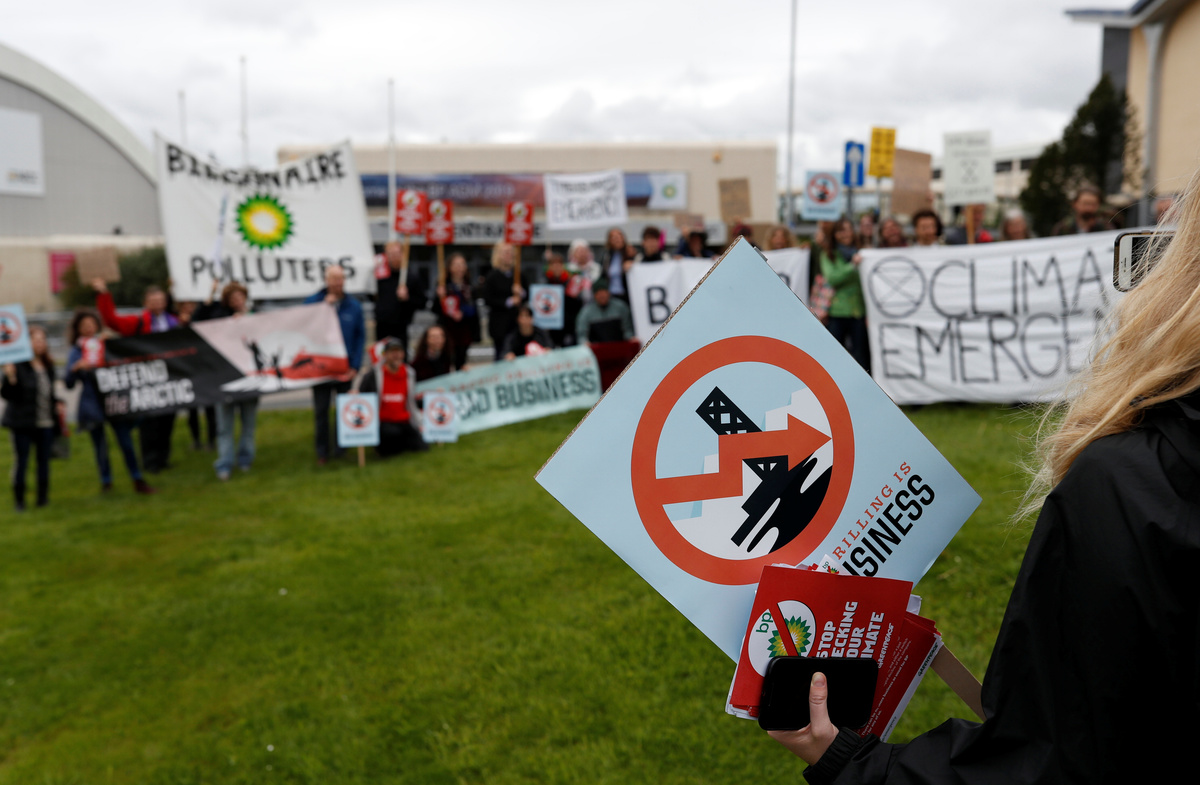 Outside the AGM, several dozen people held placards reading "BP climate criminals" and "climate emergency." Around 20 environmental activists also gathered outside Shell's AGM in The Hague.