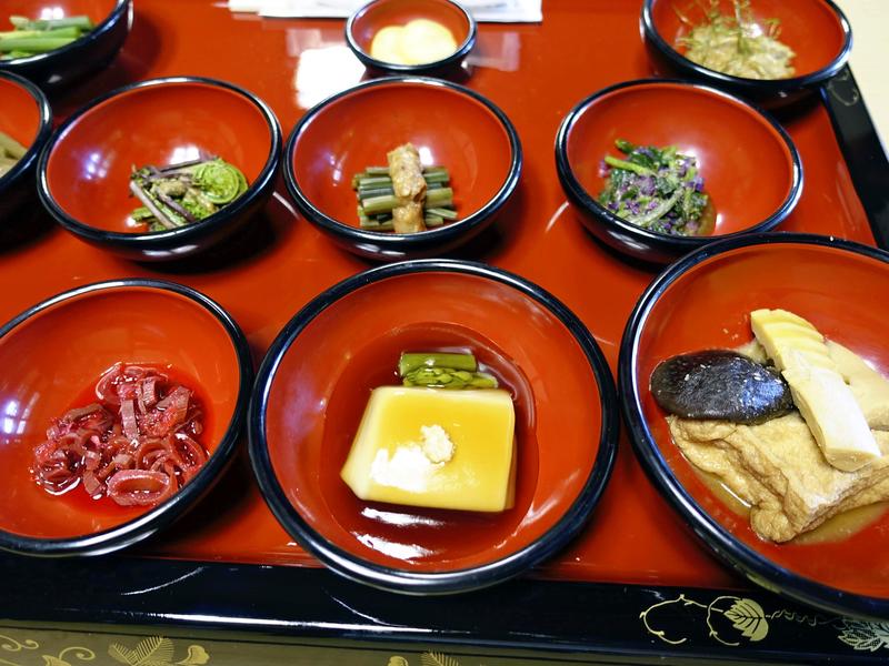 The vegetarian shojin ryori food served is what yamabushi used to eat during their training. At first, they ate raw edible wild plants collected on the mountains but eventually developed techniques for improving the taste and preserving food that are still used today.