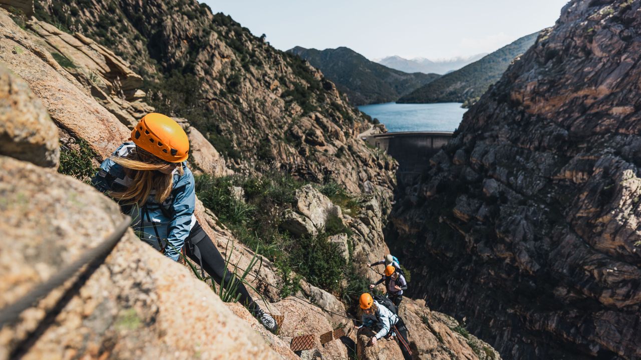 The via ferrata de Tolla is one of several such routes here in Corsica, the mountainous island neighbor to Sardinia in the Mediterranean that lies some 150 miles southeast of Nice. After a half hour or so of rocky but easy descent, we traveled across a gorge via a lengthy and exhilarating zipline ride and are now about halfway through a 90-minute climb back to the trailhead. When I look over my right shoulder, I’m treated to views of the stunning Lac de Tolla and its impressive hydroelectric dam. To my left, the sparkling Mediterranean beckons between the mountain peaks. In just about every way, the moment perfectly sums up the promise of Corsica, where rugged adventure meets a laidback beach vibe.