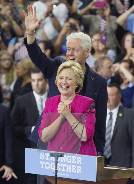 She and her husband, former President Bill Clinton, along with Kaine and the Virginia senator's wife, Anne Holton, took the stage to Marvin Gaye and Tammi Terrell's "Ain't No Mountain High Enough." They stood in front of signs that promoted one of her general election themes: "Stronger Together."