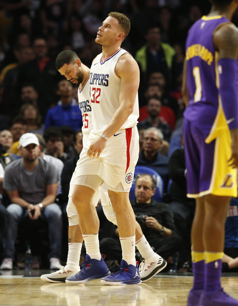 Lakers guard Lonzo Ball dribbled around Austin Rivers and into the lane. Ball lost the basketball, tried to retrieve it and lowered his shoulder into Griffin, knocking him over.