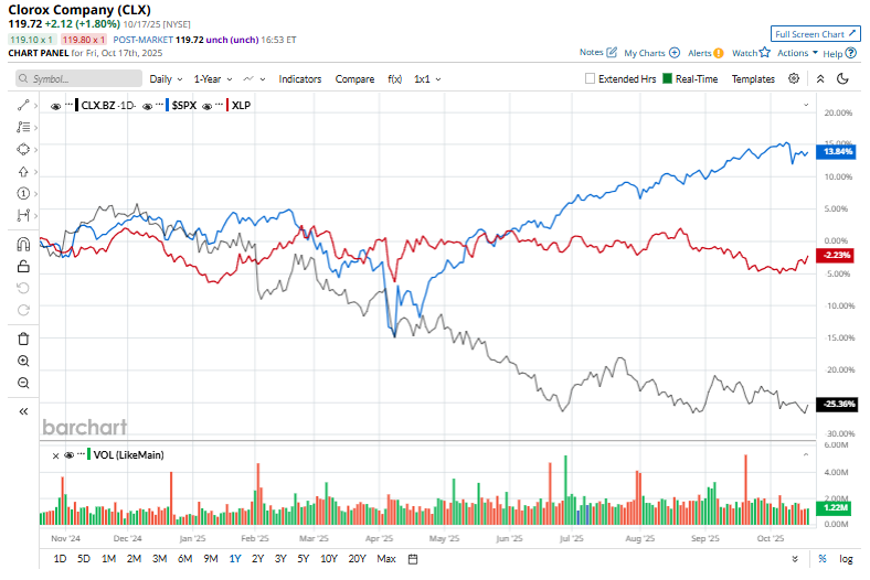 CLX stock prices have dipped 26.4% over the past 52 weeks, notably underperforming the S&P 500 Index’s ($SPX) 14.1% returns and the Consumer Staples Select Sector SPDR Fund’s (XLP) 2.8% uptick during the same time frame.
