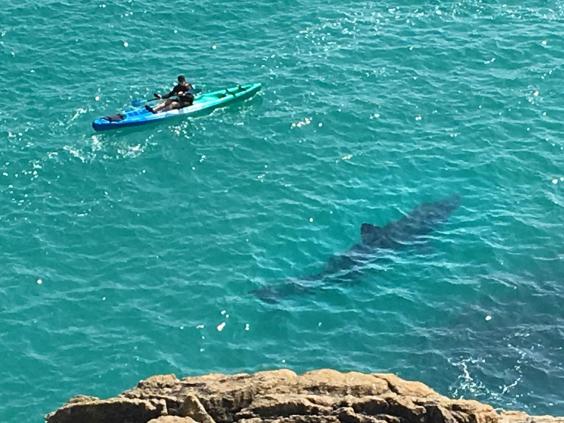 Photographs show a kayaker floating only feet away from the giant fish, seemingly oblivious to the animal swimming beneath.