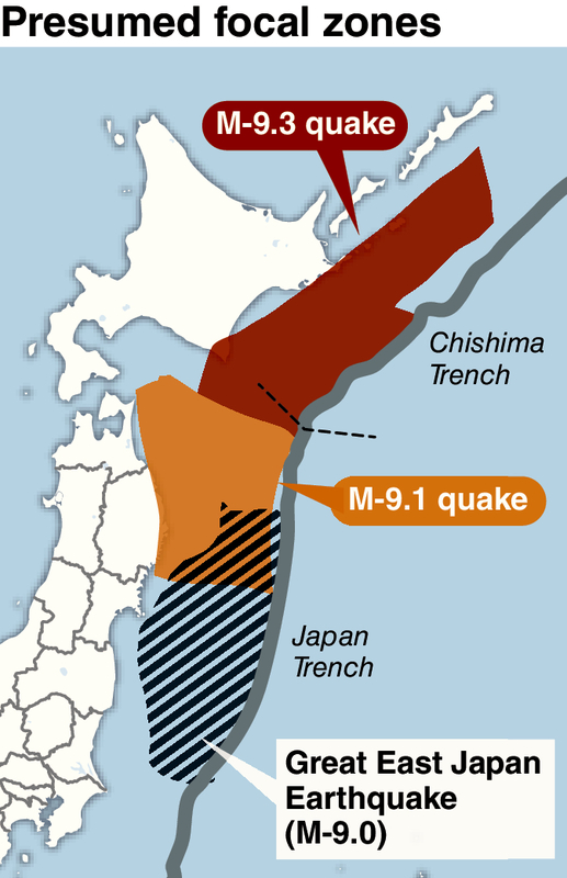 The council's working group presumed a magnitude-9.1 quake taking place in the northern Japan Trench off the coast of Sanriku and Hokkaido's Hidaka, and a magnitude-9.3 quake in the Chishima Trench off Tokachi and Nemuro in Hokkaido.