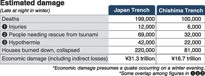 The economic damage from a quake in the Japan Trench would be 31.3 trillion yen, with 25.3 trillion yen coming from direct damage such as the destruction of 220,000 buildings, and 6 trillion yen from indirect damage, such as the loss of production and services for a year after the quake.