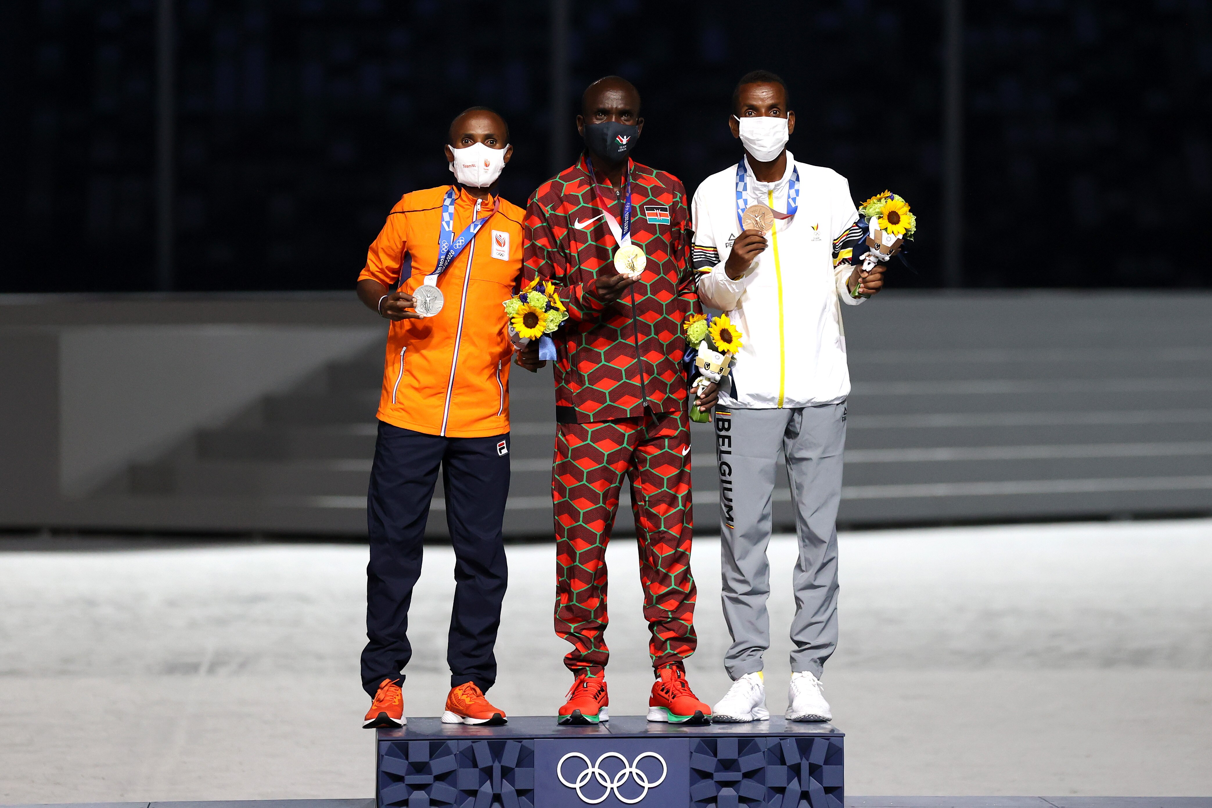 Bashir Adbi of Belgium, Abdi Nageeye of the Netherlands and Eliud Kipchoge were awarded bronze, silver and gold respectively, as were the USA's Molly Seidel, Kenya's Brigid Kosgei and fellow Kenyan Peres Jepchirchir.