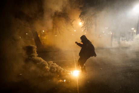 On Sept. 23, during a protest at the Justice Center building in downtown Portland, another Molotov cocktail was thrown. This one exploded when it hit the ground, creating a large fireball and spraying flames onto the leg of an officer, Demer said. Multiple videos show Muhammed throwing the device, he added.