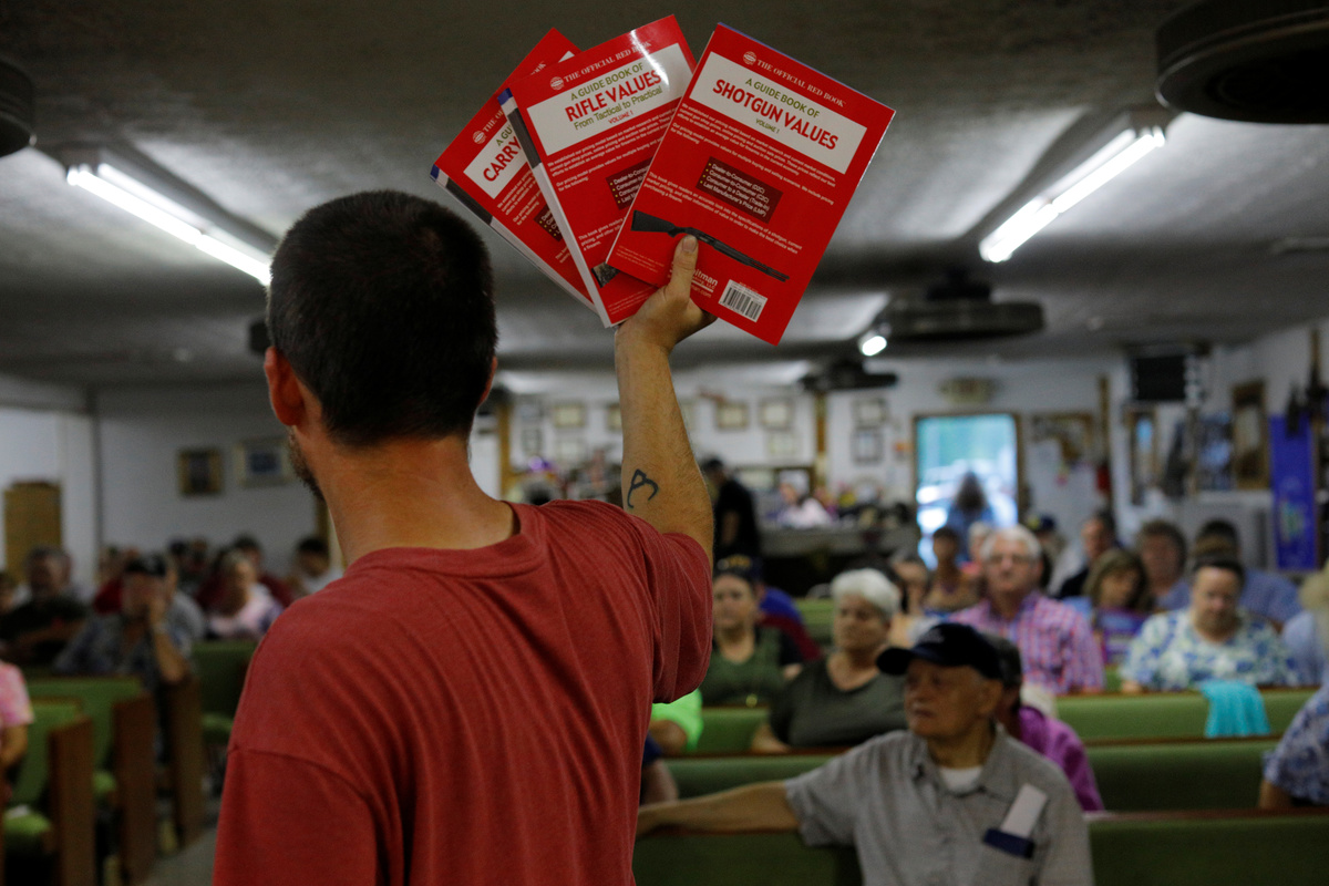 The Official Red Book Guides for Rifle Values and Shotgun Values are held up for auction at L & G Auction in North Tazewell, West Virginia, U.S., May 19, 2018. Picture taken May 19, 2018. REUTERS/Brian Snyder
