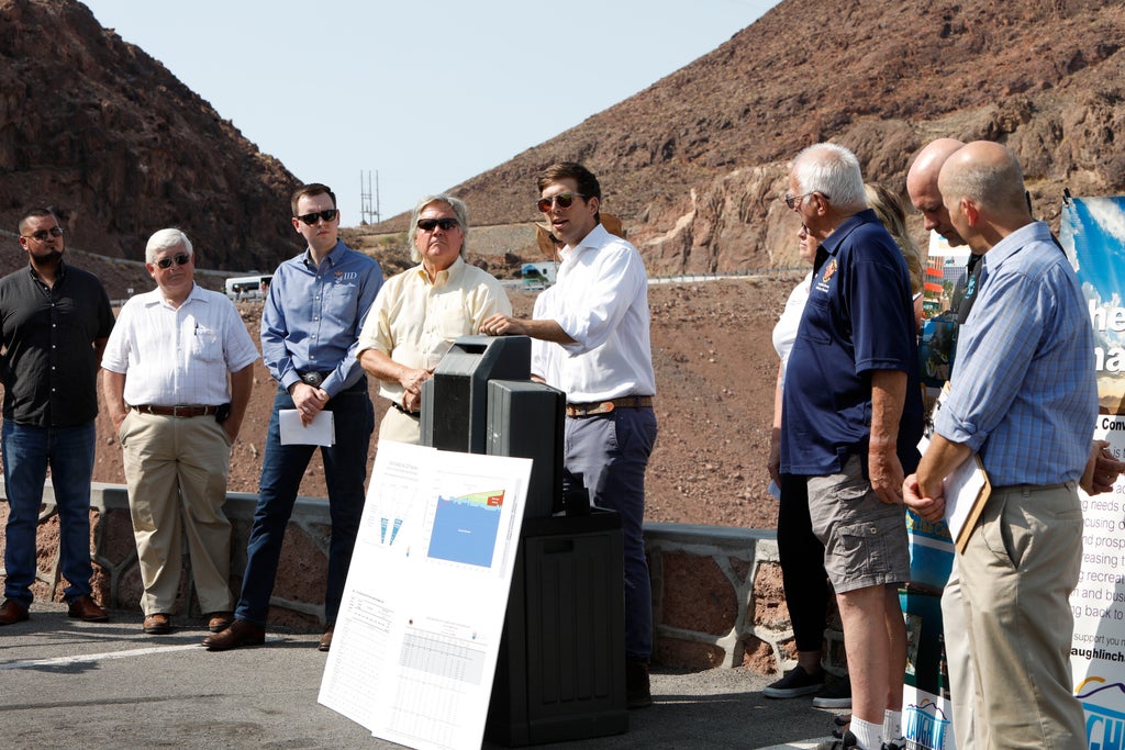 “No more business as usual. Why? Because we’re failing: It’s plain and simple. We shouldn’t be seeing that bathtub ring growing like it is,” he added, gesturing toward the white band that wraps the perimeter of Lake Mead, marking former water levels.