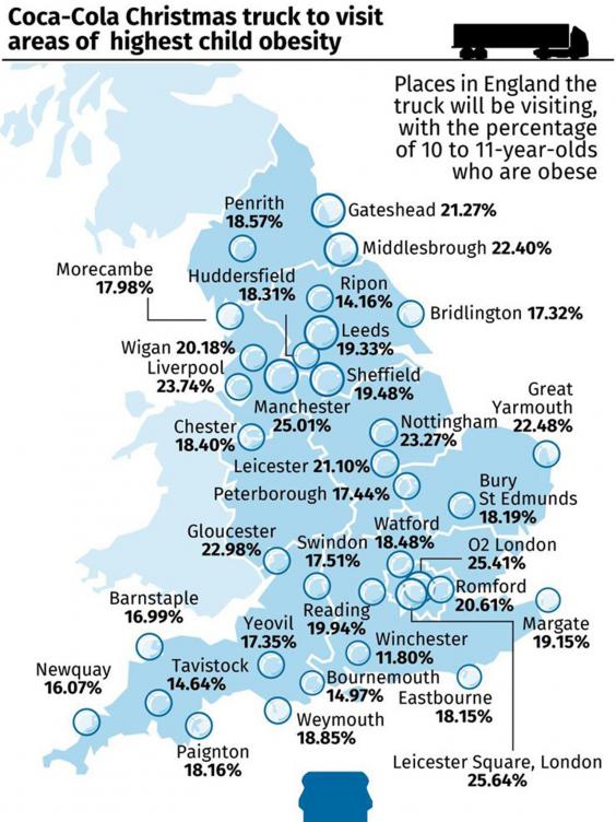 The iconic Coca-Cola Christmas truck will travel through towns with some of the highest child obesity levels in England as it makes its journey around the country.