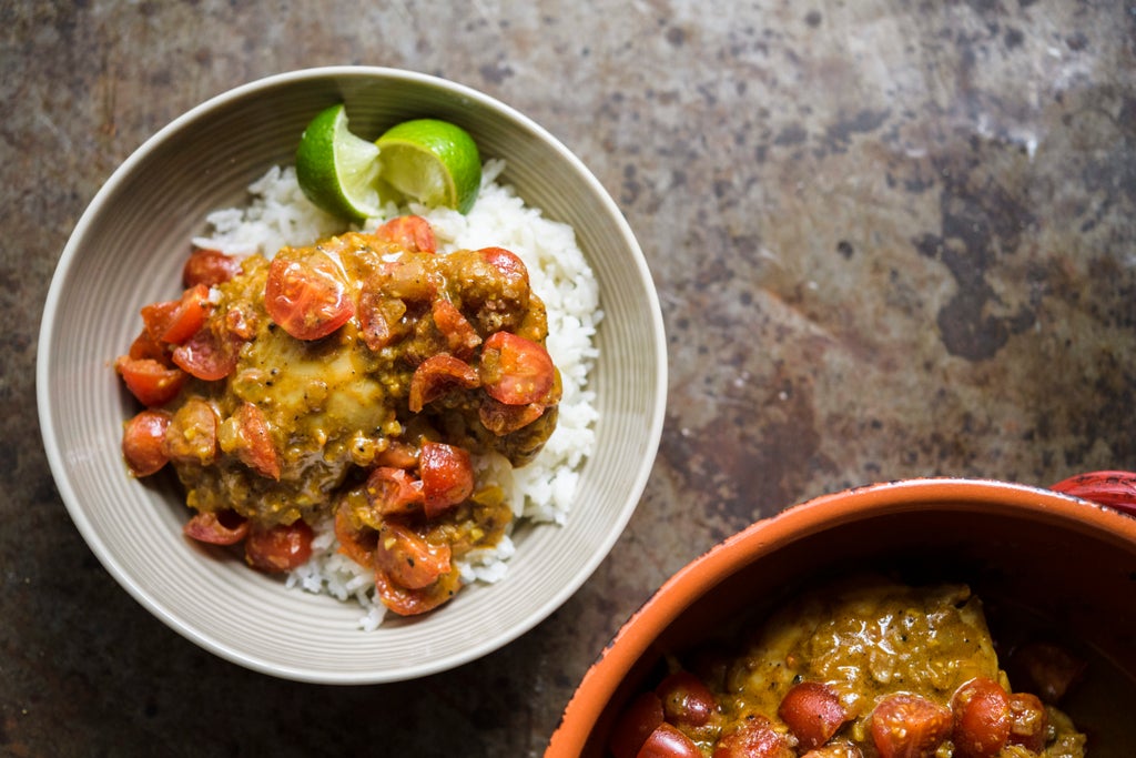 Tomato paste adds depth, and fresh cherry tomatoes — stirred in with fresh lime juice — brighten the chicken. The fresh, buttery flavor of the coconut milk enhances rather than overpowers the other flavors for a dish with a luscious texture and floral fragrance.
