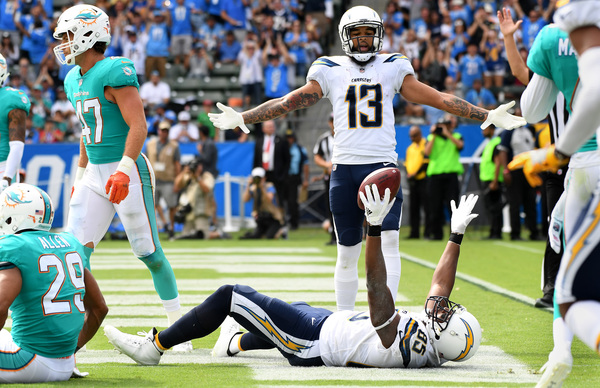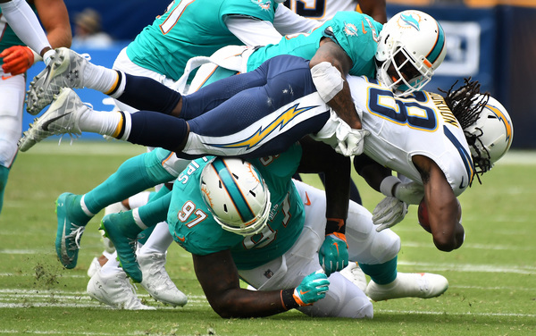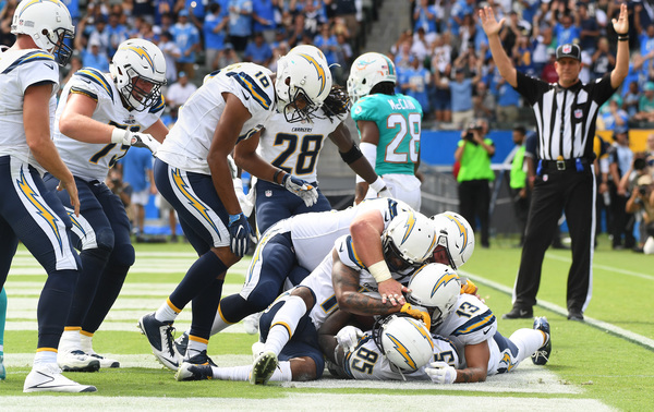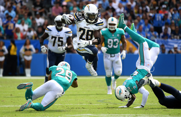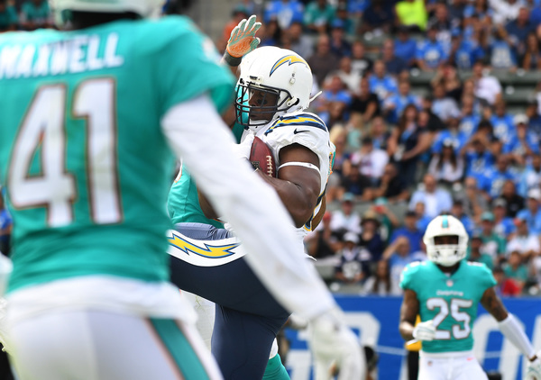 The Chargers took a 7-3 lead in the second quarter when running back Melvin Gordon crashed into the end zone from the 1-yard line. A pass interference penalty in the end zone by safety Reshad Jones put the Chargers at the 1.