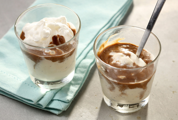 I called in rewrite. In this version, the ice cream keeps its cool in a chilled glass. It's lavished with coffee custard and finished with a swirl of whipped cream.